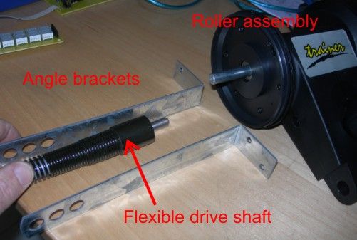 Next, attach the flexible drive to the roller, using the small tubing and two angle brackets. The brackets will be later attached to the plastic roller, so in order to do this, you should cut them down slightly and make an extra hole.