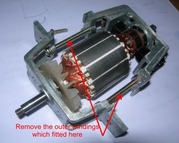Unscrew the plastic base to expose the motor, and together with it remove all electric cables and fans as you will not be needing them anymore. You also have to remove the motor brushes.